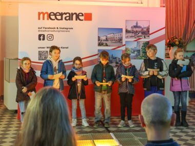 Im Mittelpunkt standen die Schülerinnen und Schüler der Friedrich-Engels-Schule, die mit einer märchenhaften Geschichte die Feierstunde eröffneten und damit die fantasievollen Gedanken hinter dem Kunstwerk vortrugen: Das „Meeraner Meerchen“, das von einem König und einer Meerjungfrau erzählt.