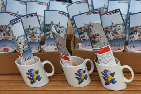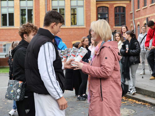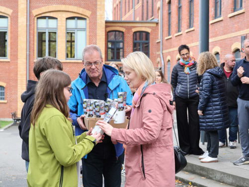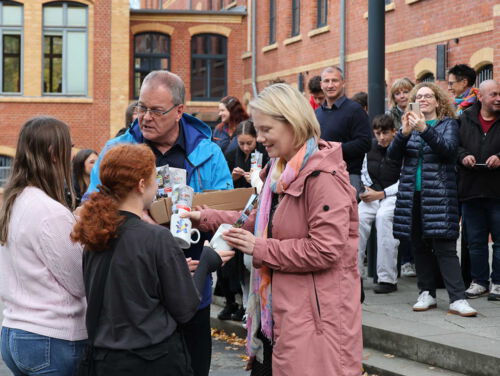 Eingeladen zum „Bergfest“ war auch Bürgermeister Jörg Schmeißer, der leider aufgrund eines anderen Termines nicht dabei sein konnte. Die Grüße der Stadt Meerane und ein kleines Geschenk für alle Schülerinnen und Schüler überbrachte Sarah Hinz, Sachgebietsleiterin Bildung der Stadtverwaltung Meerane. Gemeinsam mit Uwe Brauner überreichte sie allen Jugendlichen eine Tasse mit Meerano-Aufdruck, dem Maskottchen des Stadtjubiläums 850 Jahre Meerane.