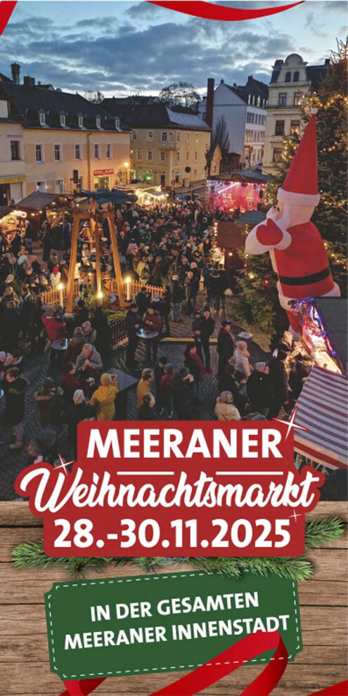 In wenigen Tagen ist es soweit: Traditionell zum Beginn der Adventszeit findet vom 28. bis 30. November 2025 der Meeraner Weihnachtsmarkt statt, in diesem Jahr wieder in der gesamten Innenstadt vom Teichplatz bis zum Markt! Alle Meeranerinnen und Meeraner und alle Gäste unserer Stadt sind herzlich eingeladen!