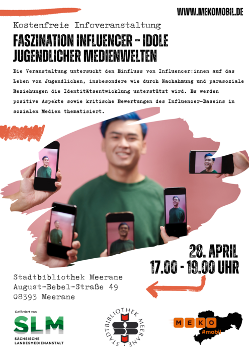 Am 28. April 2026 um 17:00 Uhr geht es in der Meeraner Stadtbibliothek um das Thema „Faszination Influencer – Idole jugendlicher Medienwelten“. Als Referentin wird die Medienpädagogin Judith Schulz den Gästen in der Infoveranstaltung mit praktischen Tipps zum Faktencheck vermitteln und zentrale Fragen beantworten. Welchen Einfluss haben Influencer auf das Leben heutiger Jugendlicher? Wie sollten Eltern und pädagogische Fachkräfte damit umgehen?