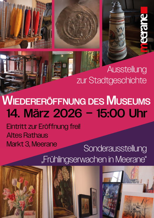 Nach konzeptioneller und gestalterischer Überarbeitung präsentiert sich die stadtgeschichtliche Schau in frischem Gewand. Historische Exponate, neu strukturierte Themenbereiche und eine zeitgemäße Präsentation machen die Entwicklung Meeranes anschaulich und nachvollziehbar. Zum Beispiel wird der Silber-Denarius gezeigt, eine Münze aus dem 12. Jahrhundert, die an König Vladislav und die erste Erwähnung der Stadt Meerane im Jahr 1174 erinnert. Zu den herausragenden Exponaten zählt auch der „Willkomm“, ein Krug der Weber-Innung. Zu sehen sein werden zudem viele weitere Ausstellungsstücke zur Weberei, Naturheilkunde, Automobilindustrie und der Lebenswelt der Meeraner und Meeraner der Vergangenheit. Die Ausstellung lädt dazu ein, Bekanntes neu zu entdecken und Zusammenhänge klarer zu verstehen. Zur Eröffnung wird Kerstin Zienert im historischen Gewand durch die Ausstellungsräume der Stadtgeschichte führen.