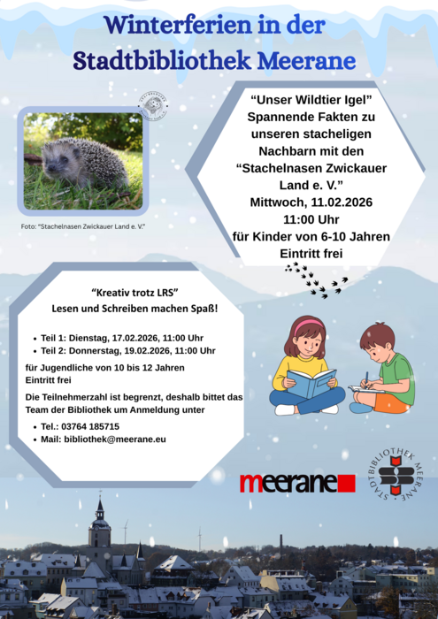Das Team der Stadtbibliothek lädt alle Interessierten herzlich zu diesem Workshop ein. Der Eintritt ist frei. Da die Teilnehmerzahl jedoch begrenzt ist, bittet das Bibliotheksteam um Anmeldung unter Tel.: 03764 185715 oder Mail: bibliothek@meerane.eu