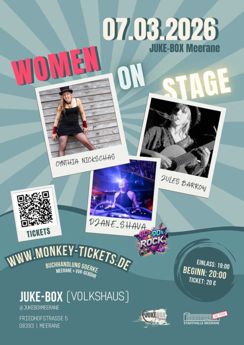 Ein Abend, drei Acts, jede Menge Musik: Women on stage heißt es am 7. März 2026, um 20:00 Uhr, in der Jukebox des Jugendclub „Beverly Hill’s“ e. V. im Volkshaus Meerane. Im SPECIAL zum Frauentag können sich die Gäste auf Cynthia Nickschas, Jules Barrow und DJane Shava freuen.